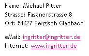 Das Copyright für veröffentlichte, vom Autor selbst erstellte Objekte bleibt allein beim Autor der Seiten. Eine Vervielfältigung oder Verwendung solcher Grafiken, Tondokumente, Videosequenzen und Texte in anderen elektronischen oder gedruckten Publikationen ist ohne ausdrückliche Zustimmung des Autors nicht gestattet.
